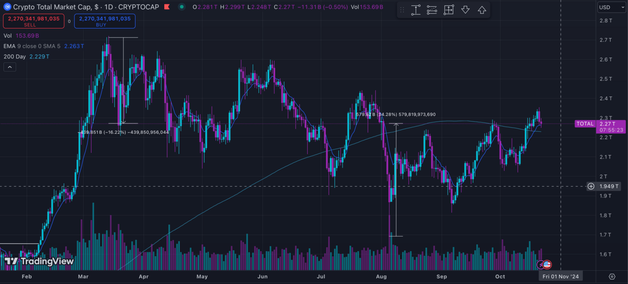 Last week we cited clear resistance for ETH “right around September’s highs at $2750.” This level remains decisively in play, highlighted by the rejection seen Sunday at $2756, and Monday at $2768. Profit taking remains recommended below this level for those who haven’t already, with reentry very much still on the table should ETH confidently breach. Looking south, we can continue to monitor the $2550 level for any signs of further downside in play. Plenty of upside remains relative to BTC, though we will recommend an extra cautious approach in the event of a market wide dip, which remains to be expected after such a long run and often affects ETH much more than its’ bellwether.