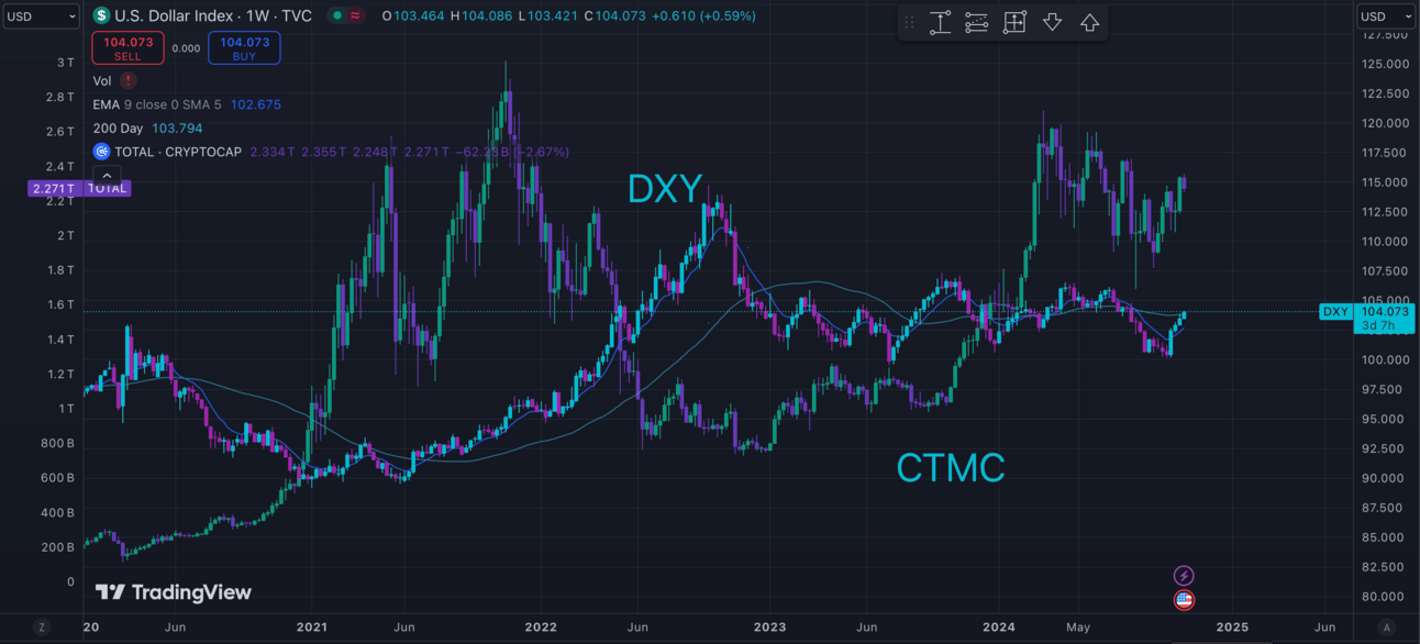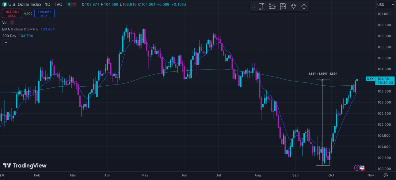 DXY continued its reversal into the 4th consecutive week, gaining another half percent off the back of rising treasury yields and ongoing geopolitical tensions in the Middle East. As predicted in last week’s report, we’ve now retested resistance at the 104 level. DXY remains just above, opening the door for further gains—though some degree of correction is to be expected considering the depth of the run. Treasury yields have seen a critical rise over the last several weeks, with US benchmark 10yrs now sitting at 4.2%. As the cost of capital increases, equities can begin to look less attractive to investors as opposed to safe gains via government bonds. This trend will continue to be well worth our attention considering the recent run of all 3 major US indices.