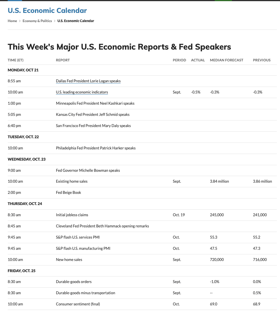 According to data from CME FedWatch, traders anticipate an 88% chance of easing in the November meeting, up slightly from last week despite somewhat hawkish Fed speak since the report. 50bps bets remain largely nonexistent. Interestingly, Polymarket seems to be reflecting recent changes much more drastically. The prediction market is currently showing a 61% chance of 100bps worth of cuts this year, up from just 38% at the beginning of October but down 6% from this time last week. Expecting a busy week ahead with speeches from the ECB and BOE and major corporate earnings. The Fed Beige Book will also be well worth our attention, released ahead of the FOMC. The book relies much more on anecdotal evidence, often presenting a more nuanced view of the economy beyond traditional statistics.
