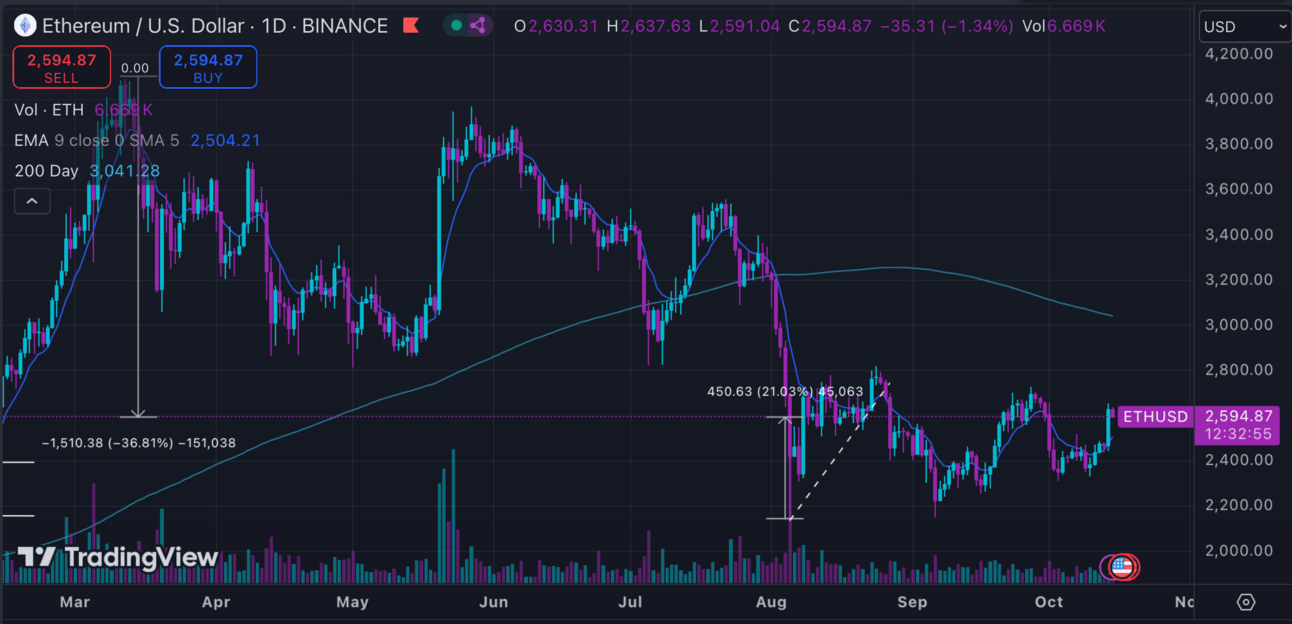 ETH/USD (BINANCE) O:2659 H:2663 L:2311 C:2440 -219.79 (-8.23%) V:143.587K