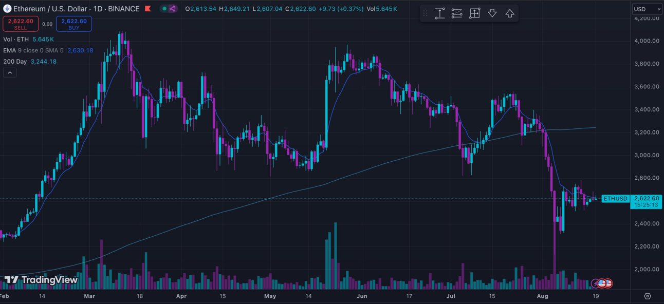 ETH/USD (BINANCE) O:2556 H:2780 L:2509 C:2612 +56.29 (+2.20%) V:206.394K