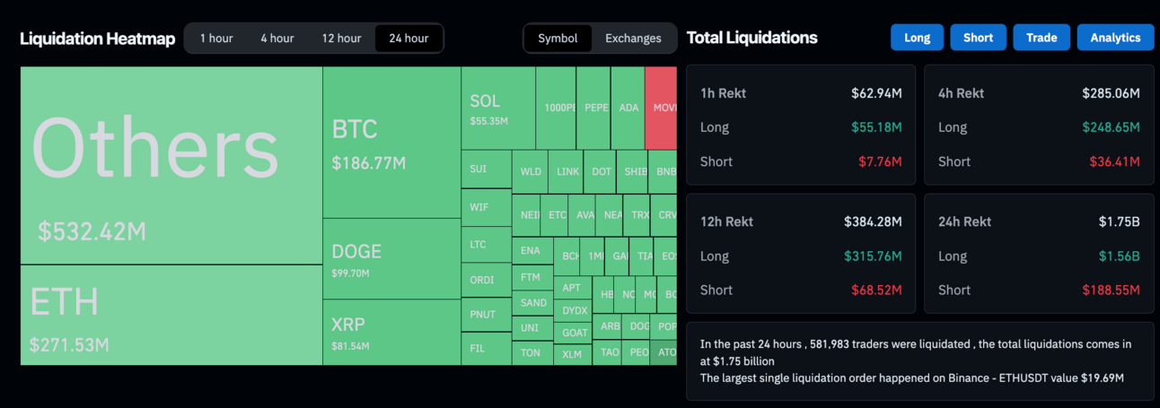 Liquidations totaled over $4B, nearly doubling last week’s already inflated numbers with the help of a head-turning $1.55B of longs wiped out on Sunday.