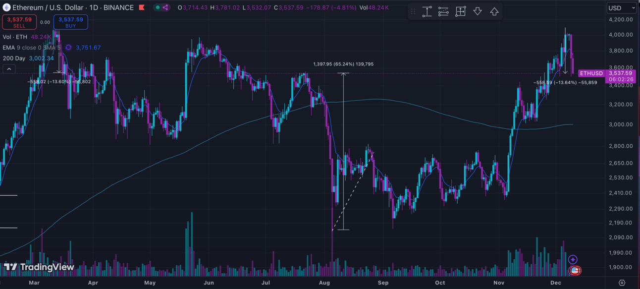 ETH/USD (BINANCE) O:3710 H:4093 L:3503 C:4007 +296.73 (+8.00%) V:475.17K