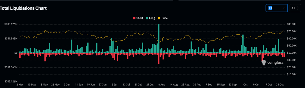 BTC saw marginal losses last week, ultimately shedding just over 1% after bouncing off support at $65,200 Wednesday afternoon. Despite the price pause, ETFs continued climbing, adding just over $1B by weekly close. Liquidations totaled $250M with an additional $85M over the last 24 hours. Since this week’s open, BTC has enjoyed a potent rally, breaching $71K for the first time since early June. Binance whale activity, significant ETF inflows, and bullish bets on the US election regardless of the winner have all contributed to the rally, which has led to $143M in liquidated shorts across CTMC.