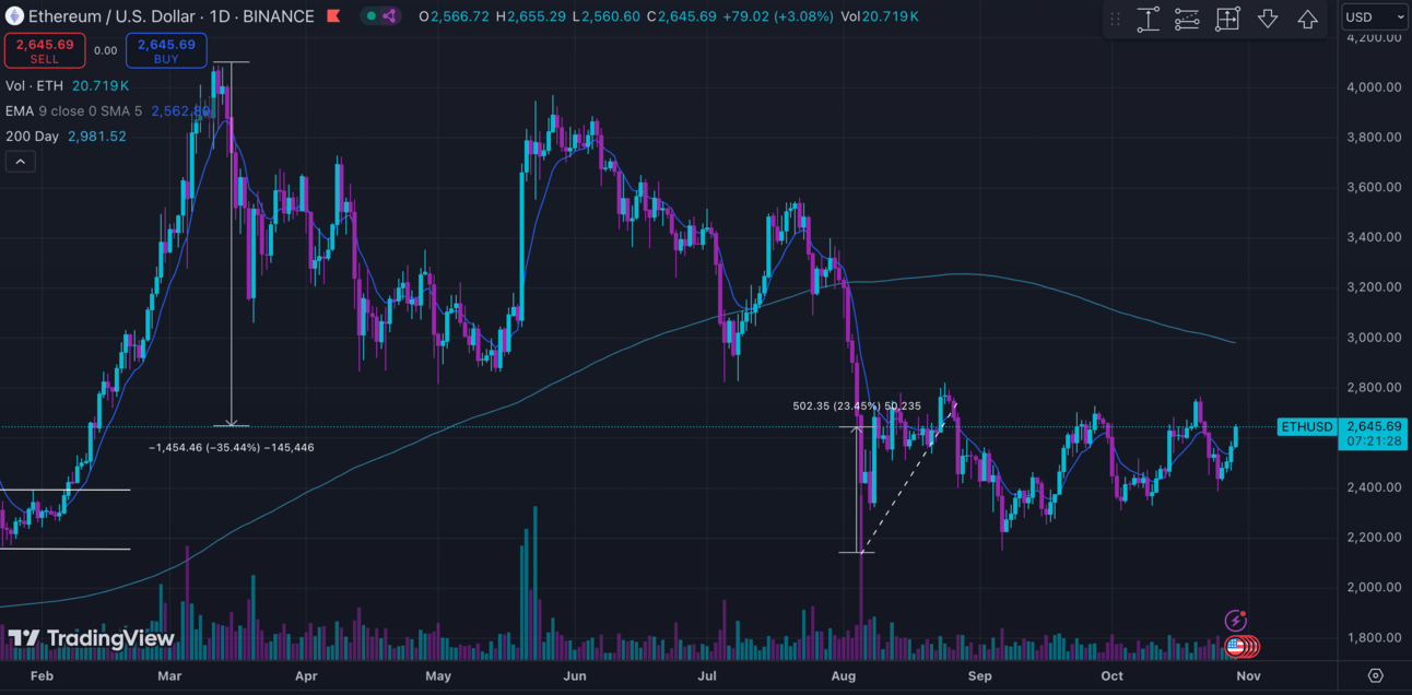 ETH/USD (BINANCE) O:2746 H:2768 L:2381 C:2505 -240.58 (-8.76%) V:154.562K